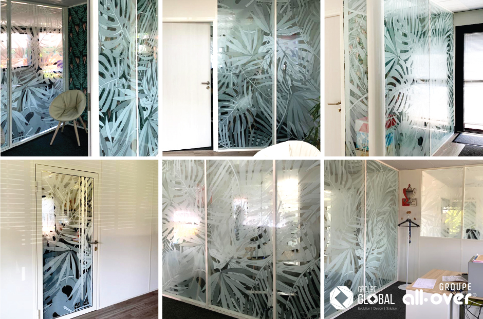 Nous avons travaillé une composition graphique «végétale» pour préserver l’intimité des employés sur ce grand plateau de bureaux. Pour un effet subtil et léger, nous avons attribué à chaque «feuille» une opacité plus ou moins blanche. Nous avons imprimé sur film Ultra Clear et nous sommes allés installer cette jolie vitrophanie à Lezennes. Un chantier réalisé sous la directive de notre fidèle collaborateur Groupe Global (Experts dans l’aménagement d’espaces professionnels).