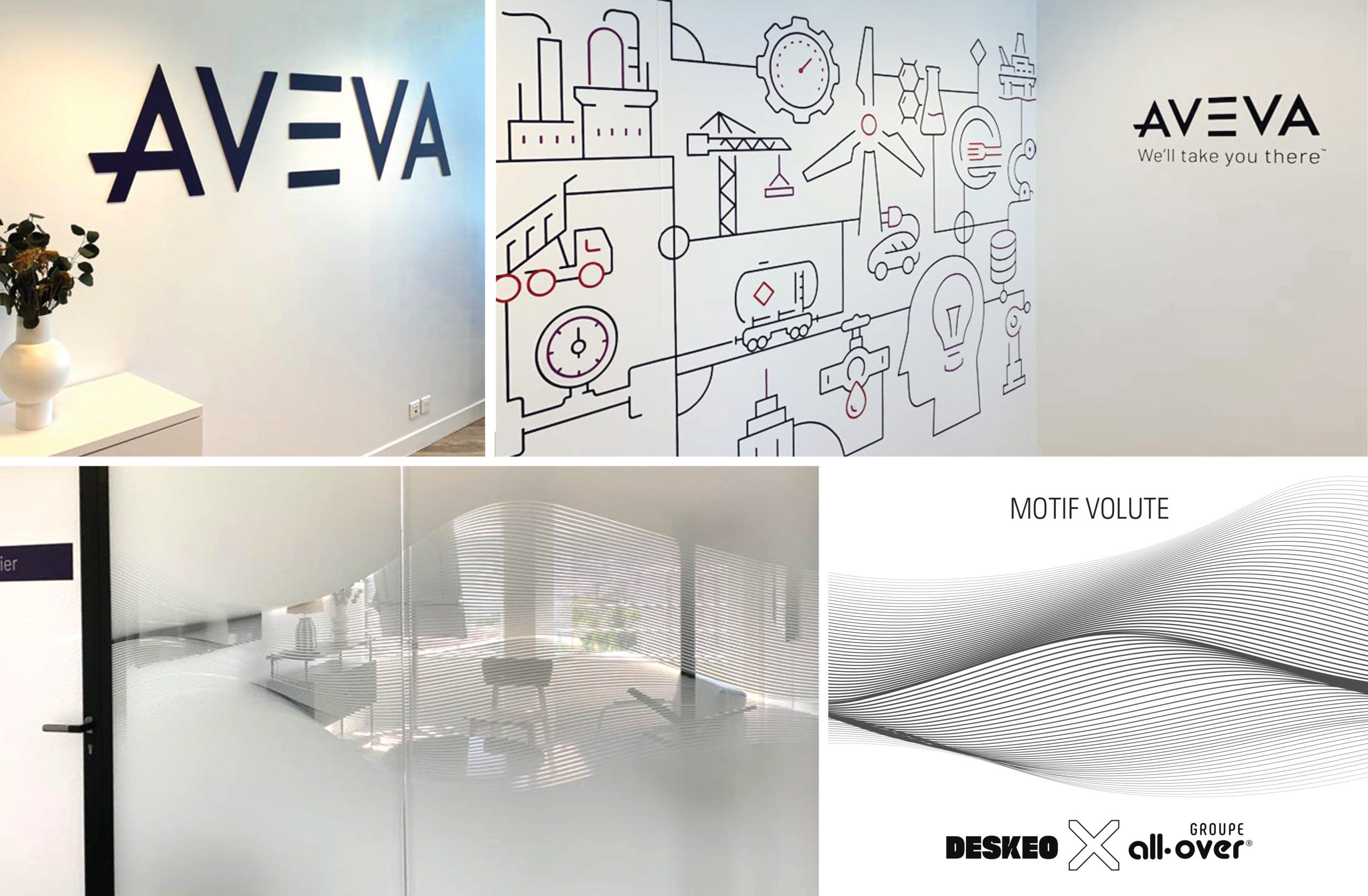 Du style avec Deskeo et du sur-mesure avec Groupe ALL-OVER ! Une signalétique réalisée en partenariat et pour AVEVA : Deskeo nous a commandité la réalisation et la pose de lettrages et décors en adhésif découpé, la création de motif avec l’impression et pose de vitrophanie…