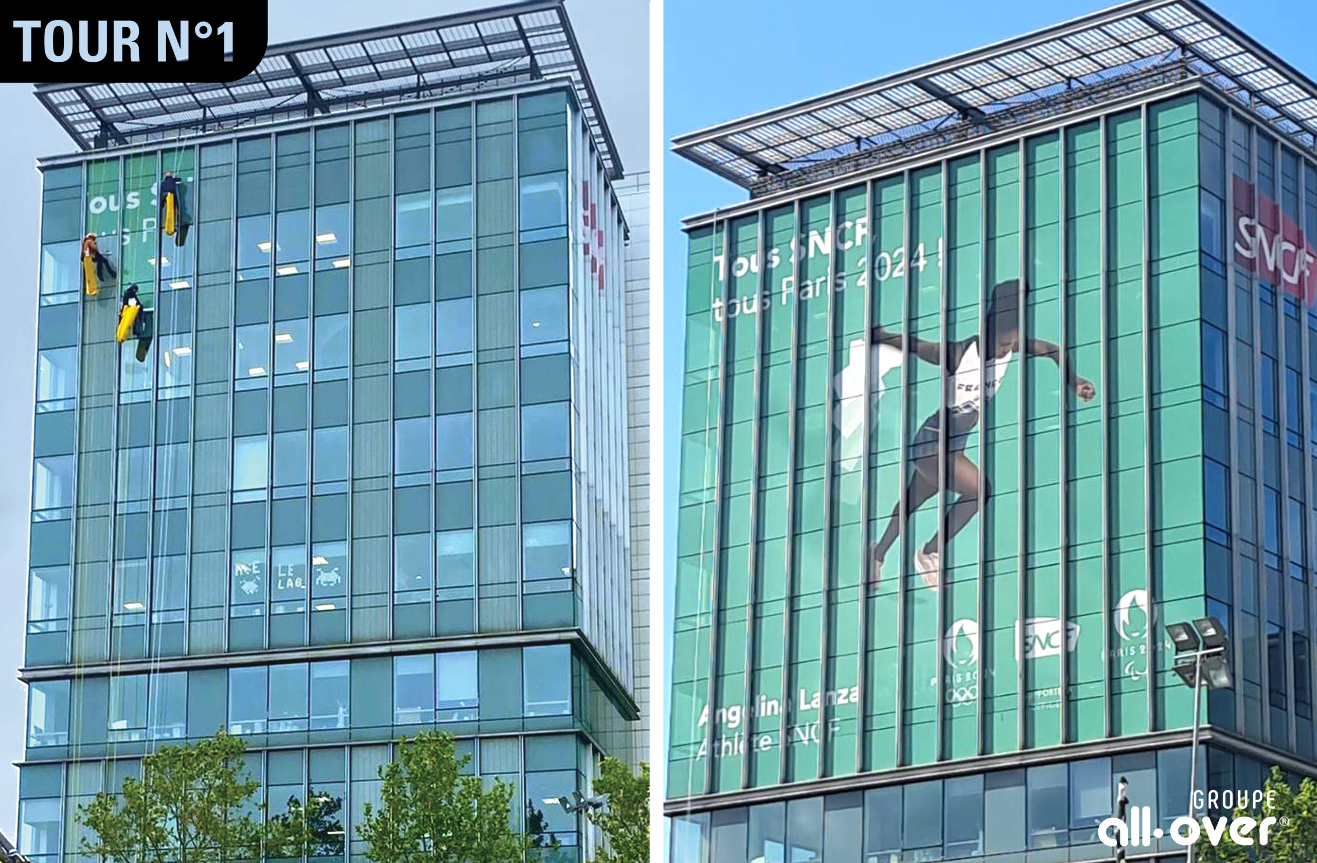 A vos marques ! La SNCF continue de se préparer pour Paris 2024, nous l’avons accompagné pour habiller sa Tour Campus étoile : impression vitrophanie et installation avec cordistes !