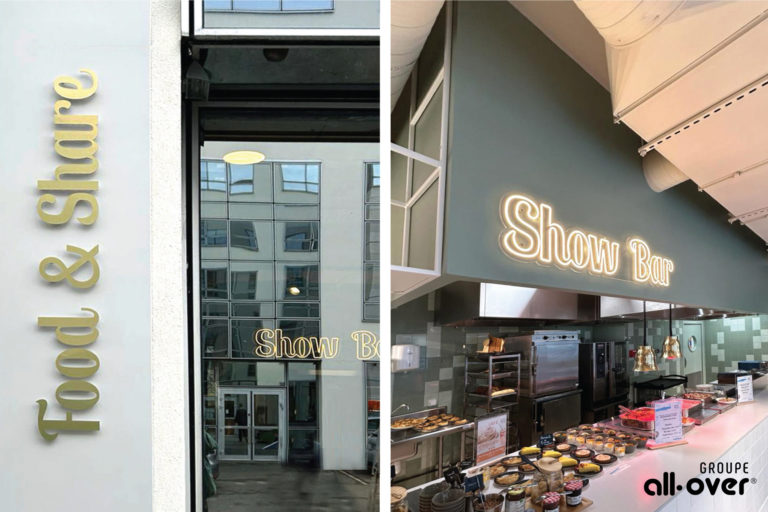 De l’élégance pour Odyssée Massy ! Des lettrages découpés en Dibond « effet or brossé » et des enseignes intérieures…