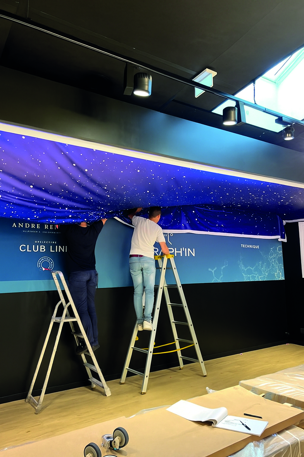 • PLAFONDS & STRUCTURES SUSPENDUES, intégration d’éclairage, habillage, installation d’éléments de signalétique en hauteur.
