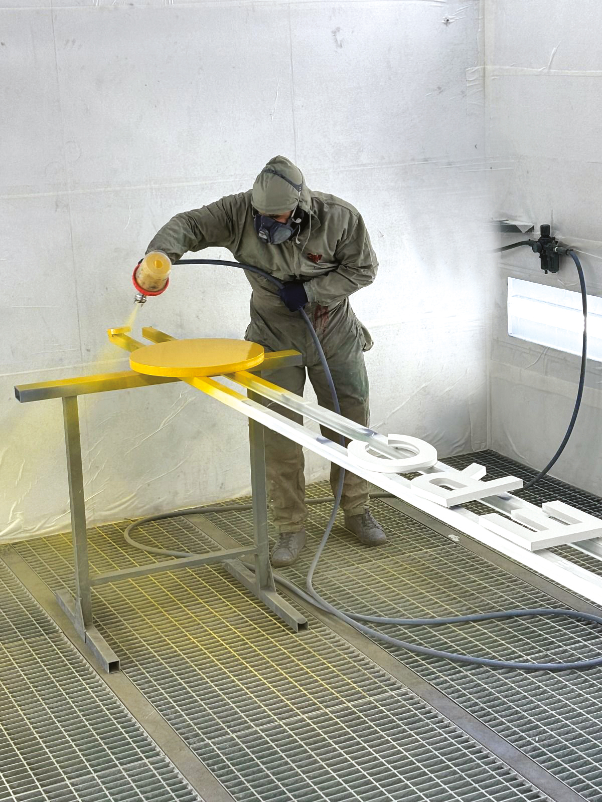 - Cabine de peinture liquide SAIMA – application sur matériaux plastiques de couleurs spécifiques (Pantone).