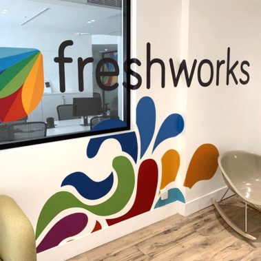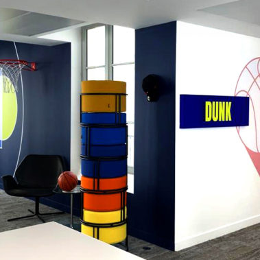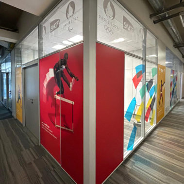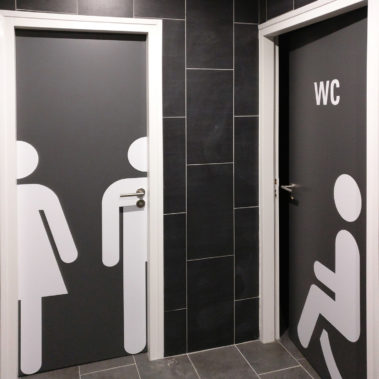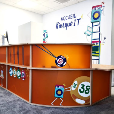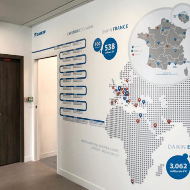 Le décor adhésif vous permet une personnalisation illimitée dans vos bureaux, bâtiments, commerces > la seule limite est votre imagination ! La décoration murale a l’avantage de structurer vos espaces… Vous pouvez y intégrer votre signalétique directionnelle, votre logo ou encore un visuel qui va embellir et égayer l’environnement de vos collaborateurs ou usagers. Nos infographistes sont là pour vous accompagner dans vos créations sur-mesure et selon votre thématique, charte graphique ou les tendances du moment. Nous mettons à votre disposition un large choix de visuels et images ainsi qu’un nuancier de couleurs d’adhésif à couper le souffle !