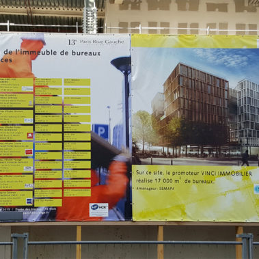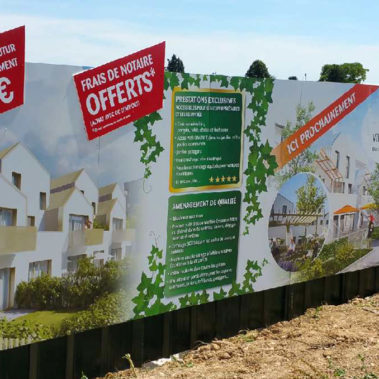Les palissades de chantiers et échafaudages dissimulent et sécurisent vos chantiers et sont d’excellents supports de communication. Ce sont les derniers espaces de publicité grand format en zone urbaine non taxés ! Alors profitez-en et confiez nous votre projet : nous avons la maîtrise de l’impression et pose des panneaux grands format qu’ils soient sur-mesure ou standards :
